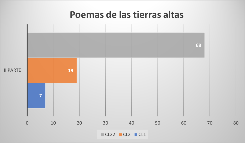 En cuanto a las formas del agua, se mantiene el equilibrio entre las dos partes del poemario. Sin embargo, la presencia del segundo campo léxico, referido a las palabras más ligadas al agua, disminuye en Poemas para las tierras altas, que por otra parte aumenta muchísimo en vocablos del tercer campo léxico.