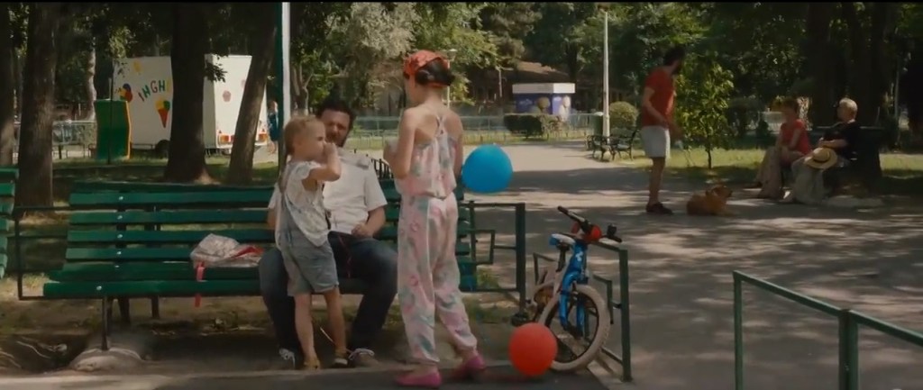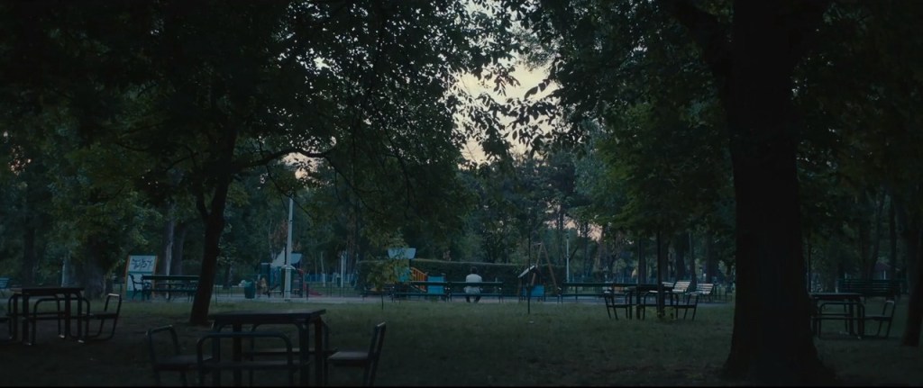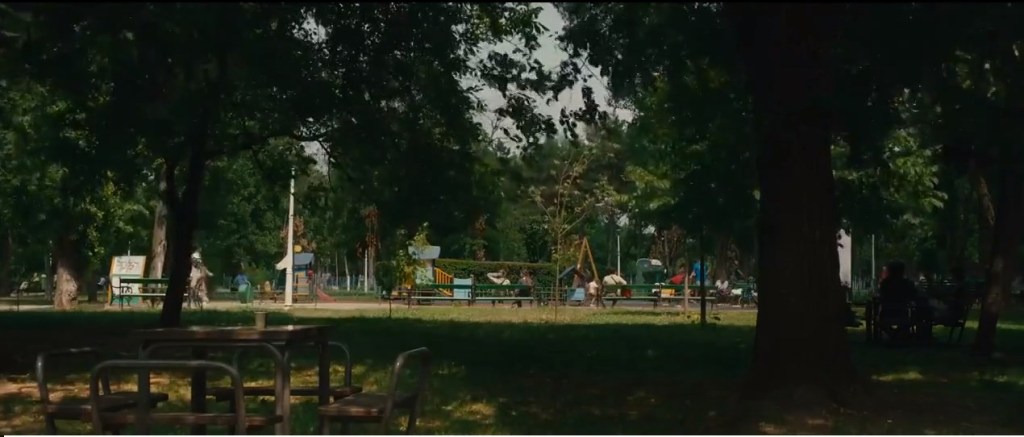 Por otra parte, la cámara también juega un papel interesante en la película. En el mismo plano secuencia se puede ver a los personajes moverse como olas, van y vienen manipulando las distancias en relación con la lente. Mientras están en el parque, María (protagonista del relato) y Túdor hacen una especie de danza visual. María se aleja de la cámara cuando va al baño y cuando va por el helado; Túdor lo hace cuando va por su hija al baño, cuando va por el café (ambos en distintos momentos), pero también vemos como María se acerca mucho a la cámara y a gran velocidad mientras corre por el parque y anda entre los juegos.