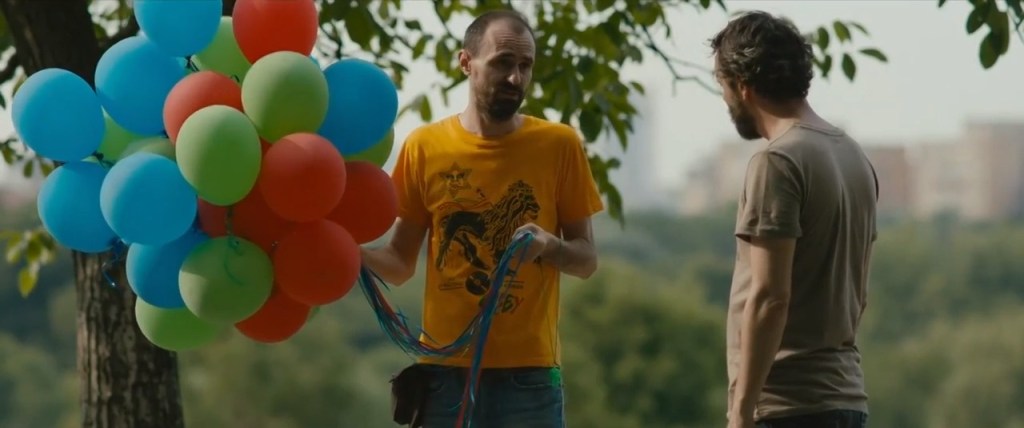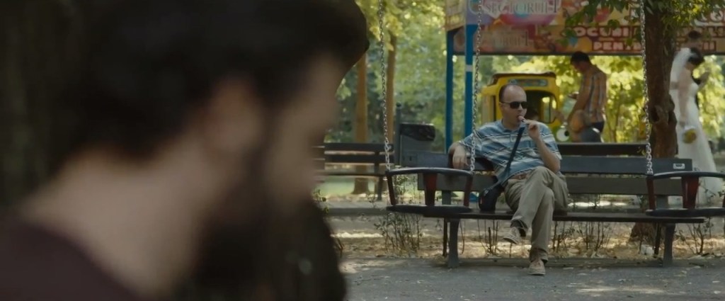 Luego, en el parque, Túdor contesta el teléfono en varias ocasiones, hay un hombre discutiendo con unas señoras sobre la presencia de los perros en el parque (porque él lleva uno, por supuesto), se escucha a los niños hablar y reír y, finalmente, están las conversaciones entre Túdor y sus hijos u otras personas del parque. En ese momento del plano, todas las conversaciones y sonidos se perciben de manera simultánea y no es casualidad que las voces de los protagonistas queden en un segundo plano auditivo.
