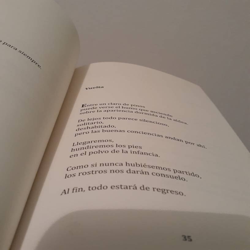 Por ejemplo, en el poema inaugural el verso He sido un fantasma (pág. 33), el término fantasma nos remite a lo que ya no está, pero estuvo. De esta manera continúa en el segundo poema: faltará el espejo (pág. 34), donde faltará, remite a eso que está y no estará. En Vuelta, el tercer poema hay tres adjetivos que tienen esa misma intencionalidad: Desde lejos todo parece silencioso, / solitario / deshabitado /… Más tarde en el mismo poema, Cardona se vale de la metáfora para manifestar la ausencia: hundiremos los pies / en el polvo de la infancia. La infancia que es ya imposible en el presente.