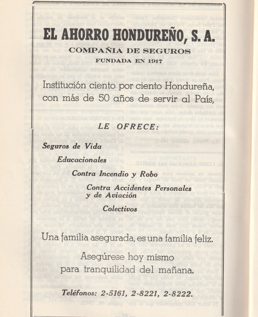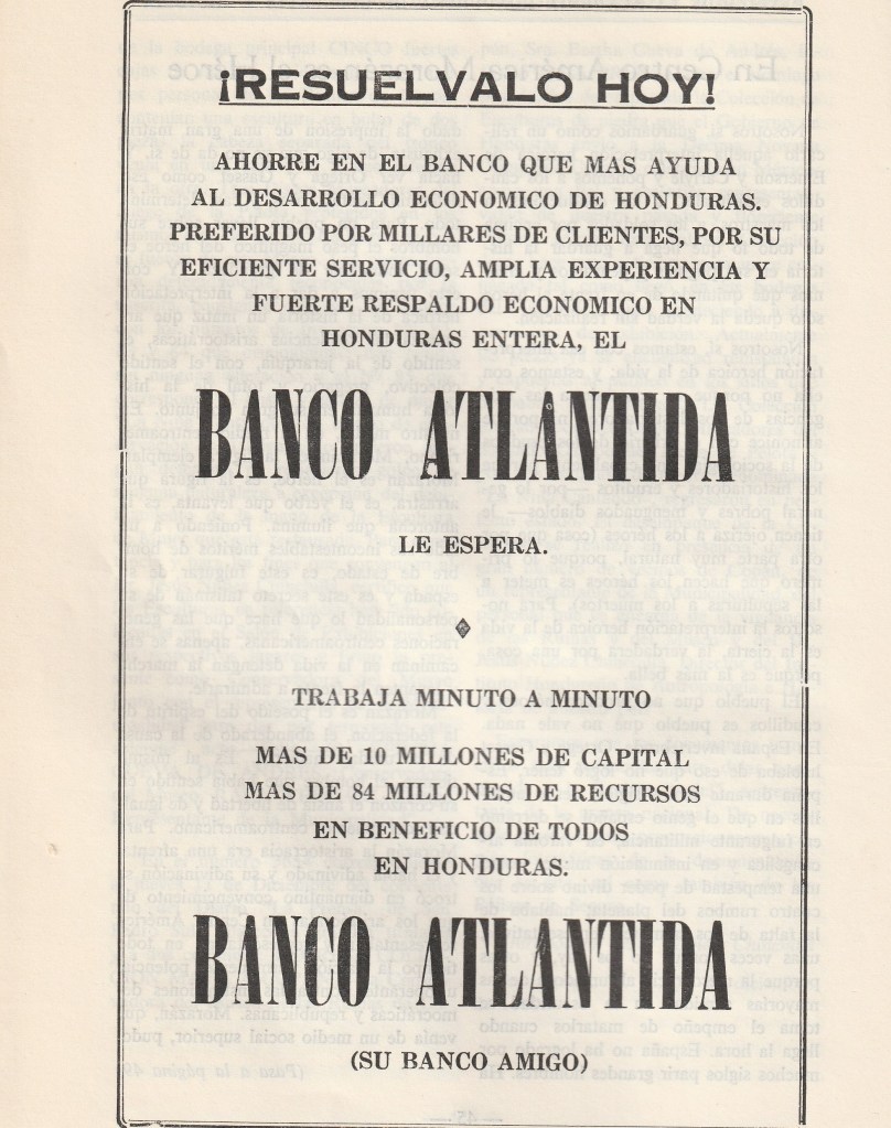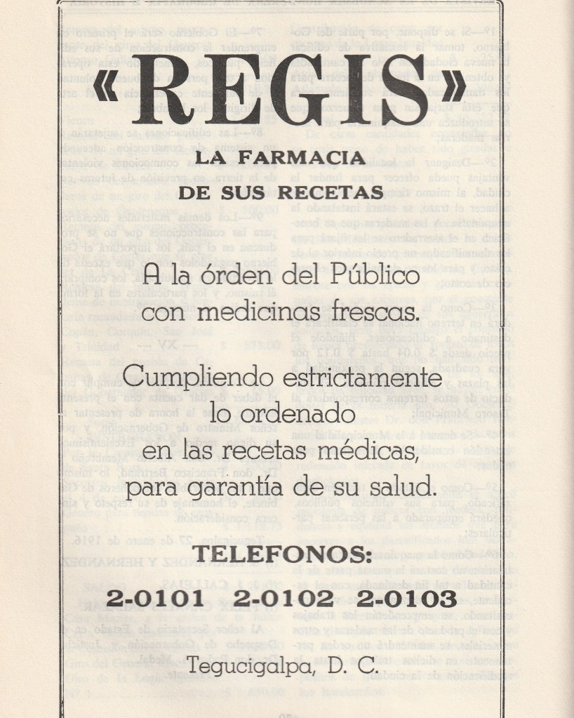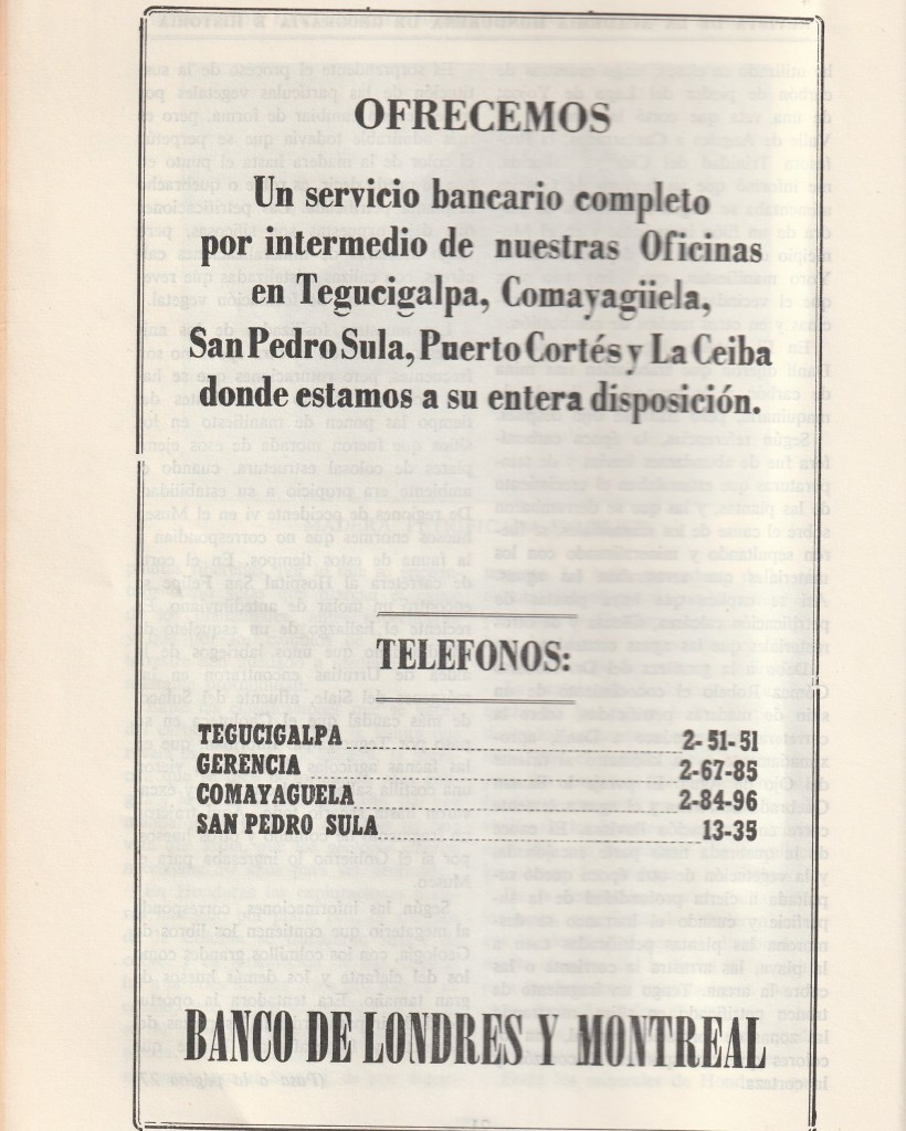 Farmacia Regis, una de las míticas de Tegucigalpa, ofrecía sus frescos medicamentos al público a través de un sencillo mensaje. Vemos que ha cambiado su eslogan. Pasó de La farmacia de sus recetas a La farmacia más conveniente. Por cierto, las comillas no eran necesarias en el nombre. Otro detalle curioso es que el número de teléfono solamente tenía cinco dígitos. ¿Lo notaste? En el anuncio de Banco de Londres y Montreal se evidencia que en San Pedro Sula solo tenía cuatro.